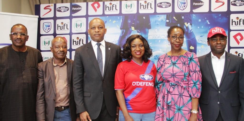 L-R: Technical Committee, Nigerian University Games Association (NUGA), Professor M.G Yakasai, Vice President of Nigerian University Games Association (NUGA), Mr. Emeka Ogbu, CEO Stanbic Bank IBTC Trustees, Charles Omoera, Brand and Activation Manager, PZ Cussons Consumer, Eniola Ogunlade, Chairman Board of Directors, Brooks and Blake Nig. Ltd, Ms. OluwaFunmilayo Onajide and Director of Pace Sports and Entertainment Marketing (PSEM), Mr. Sola Fijabi, during the International Press Conference to announce the commencement of the 2020 Higher Institutions Football League (HiFL) in Lagos