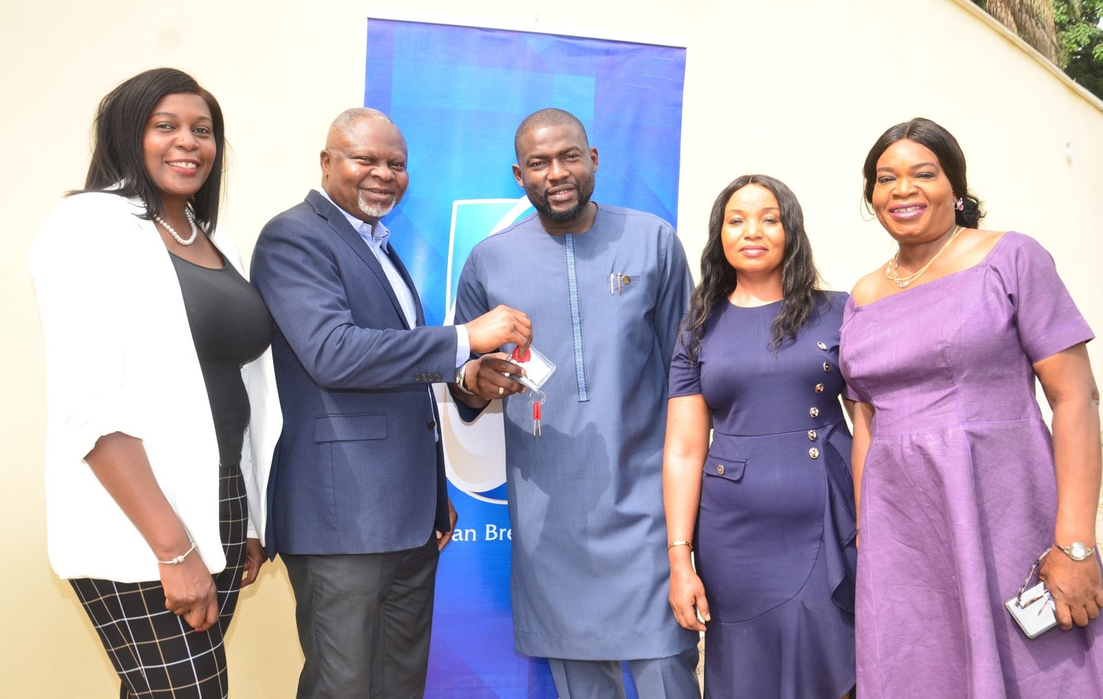 L-R: Ogochukwu Agu, Business Development Manager, Nigerian Breweries Plc; Uche Unigwe, Sales Director, Nigerian Breweries Plc; Fuad Atanda-Lawal, Chairman, Ikoyi/Obalende, Local Council Development Area(LCDA); Chisom Onyeka, Corporate Affairs Advisor(Lagos), Nigerian Breweries Plc and Taiwo Danso, Director, Treasury and Revenue, Ikoyi/Obalende LCDA during the handover ceremony of toilet facility donated by Nigerian Breweries Plc to Ikoyi/Obalende LCDA in Lagos