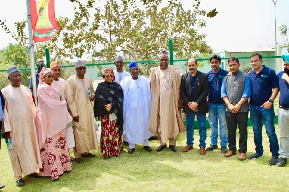 Sabo Nanono (m), Minister of Agriculture, with management and staff of Stallion group, at the minister’s visit to the Stallion Mills and Farms in Kano.
