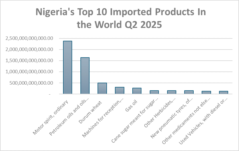 In intra-African trade, crude oil again tops the list at ₦1.26 trillion, alongside jet fuel (₦408.7 billion) and gas oil (₦404 billion).
