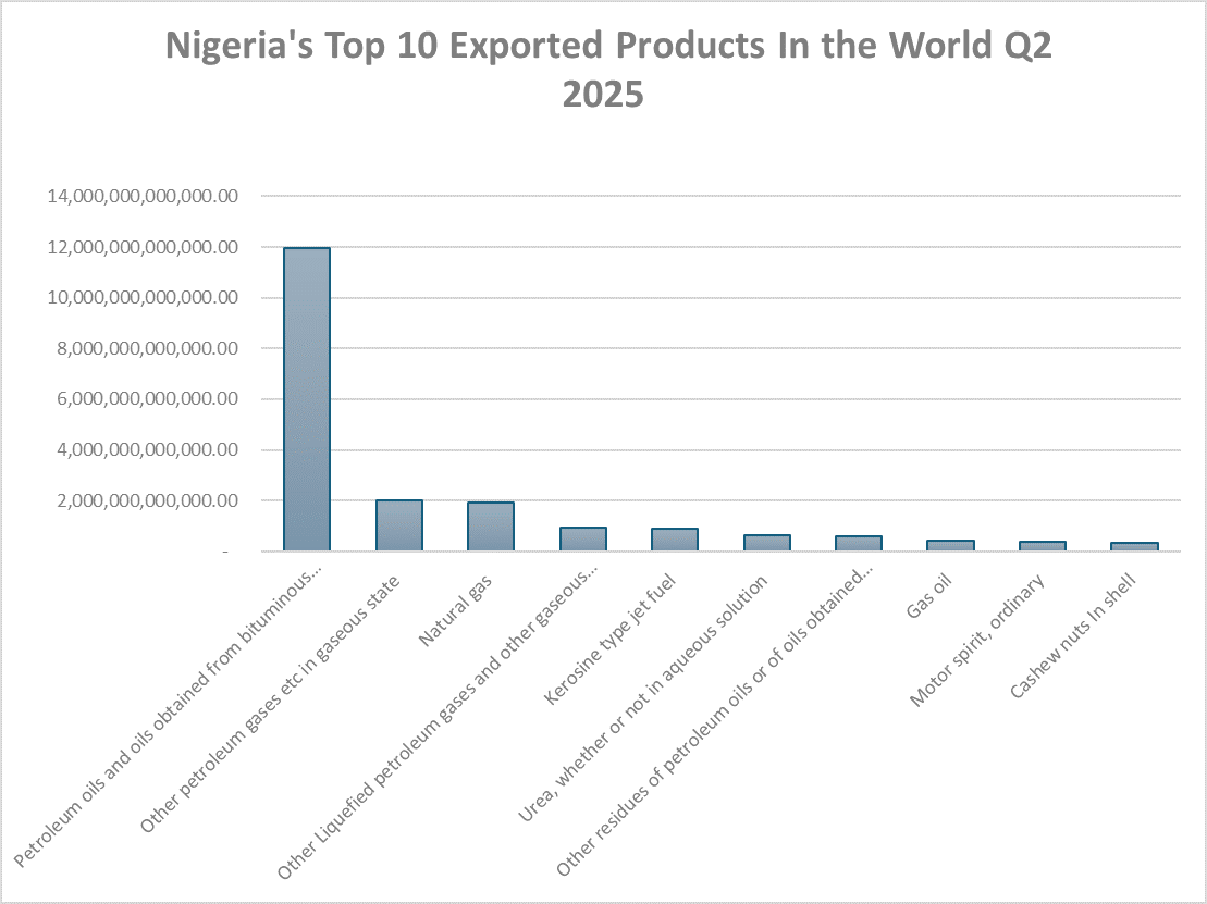 Interestingly, urea (₦615.7 billion) and cashew nuts in shell (₦352.6 billion) stand out as non-oil exports, signaling growing diversification in global markets.