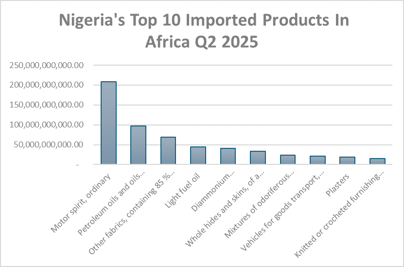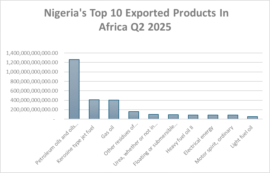 In intra-African trade, crude oil again tops the list at ₦1.26 trillion, alongside jet fuel (₦408.7 billion) and gas oil (₦404 billion).