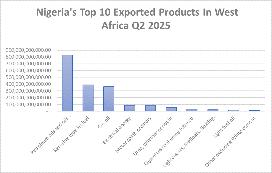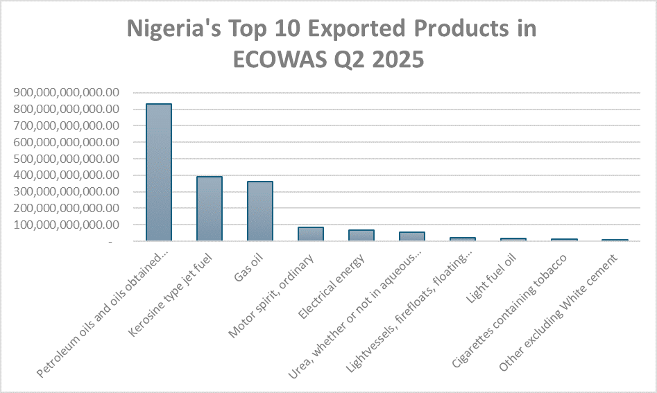 Within ECOWAS, petroleum oils remain dominant (₦829.8 billion), followed by jet fuel (₦390.1 billion) and gas oil (₦362.3 billion). Yet, products like cigarettes (₦31.2 billion), light vessels (₦21.9 billion), and urea (₦55.7 billion) reveal diverse trade flows within the sub-region.