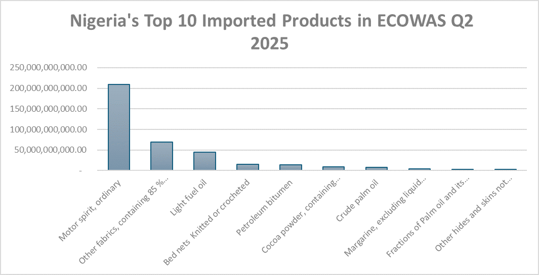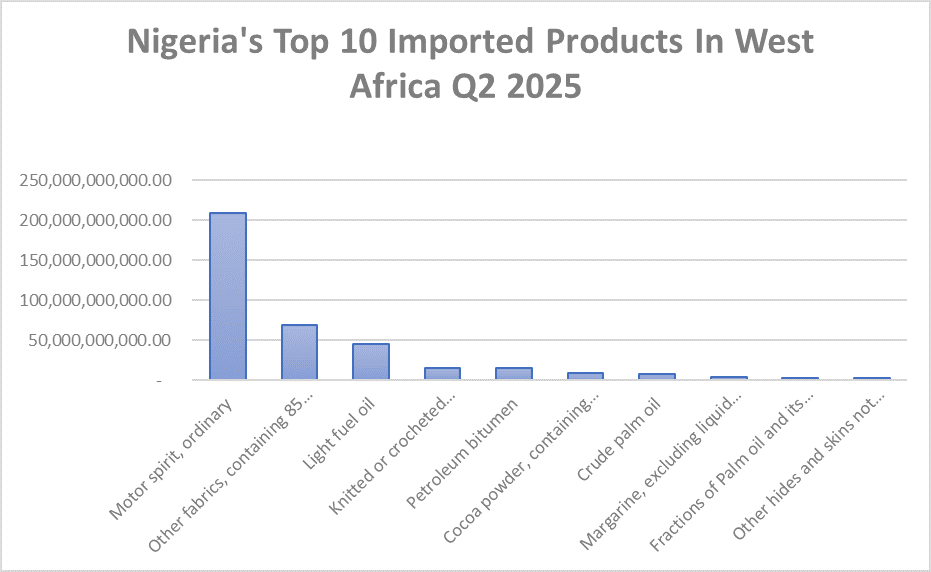 Regionally, Nigeria’s trade shifts slightly, with motor spirit (₦208.8 billion) leading, followed by crude oil (₦97.2 billion). Non-oil items such as silk fabrics (₦69.3 billion), hides and skins (₦33.3 billion), and food industry odoriferous mixtures (₦23.2 billion) emerge strongly.