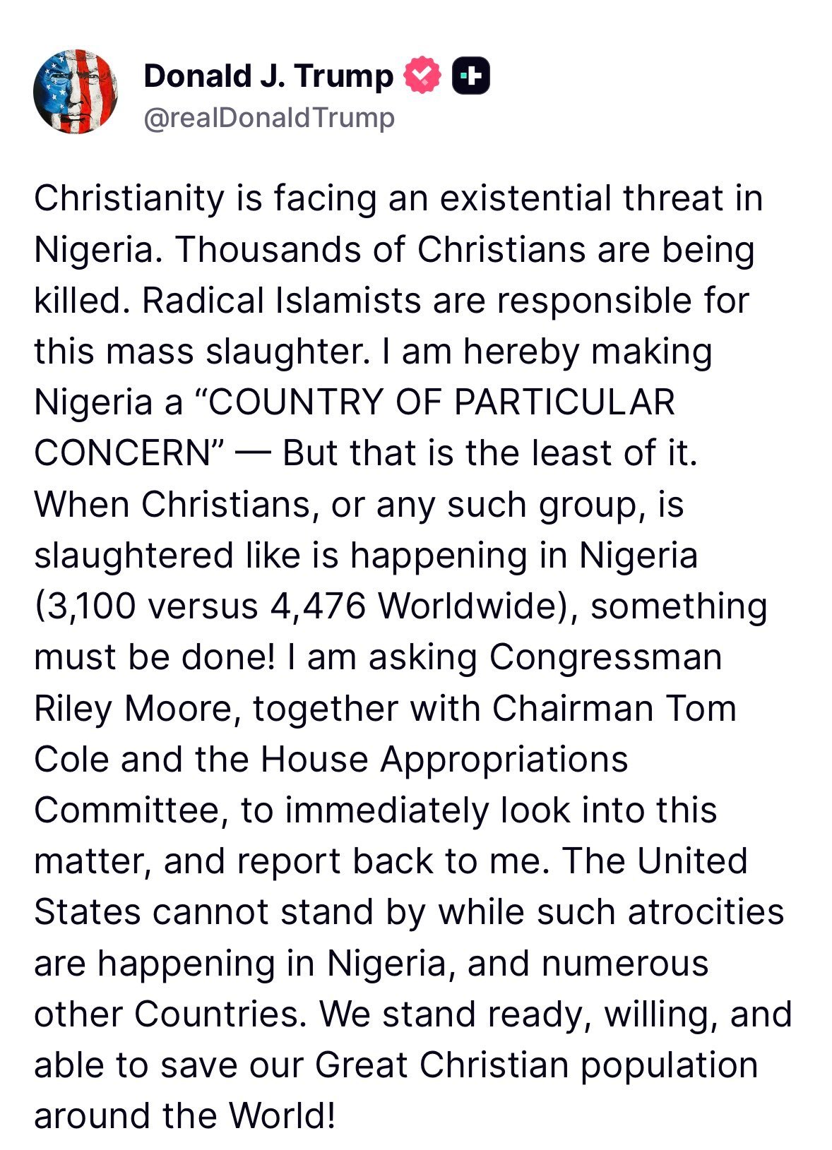 Trump used stark language in his announcement, claiming Christianity faces an existential threat in Nigeria. “Thousands of Christians are being killed,” he wrote, adding that “radical Islamists are responsible for this mass slaughter.”